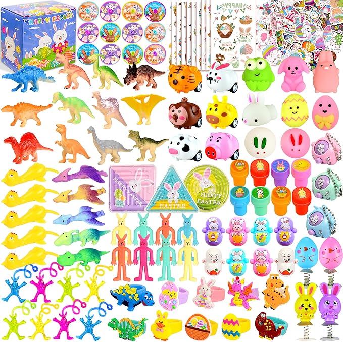 Inside this extensive set, discover 160 fun-packed treasures: from temporary tattoos and Easter stickers to miniature toys like dinosaur figures and pull-back cars. Each item is crafted from child-safe, durable materials, ensuring hours of safe play and exploration.