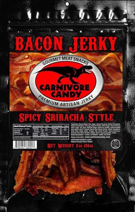 9. JURASSIC JERKY’S Carnivore Carnivore Candy Bacon Jerky – Spicy Sriracha