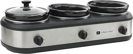 Introducing the CULINARY CHEF Triple Slow Cooker, your ultimate ally for hosting magnificent gatherings. Especially suited for home chefs and entertainers, this versatile appliance offers cooking, warming, and serving capabilities, making it a game-changer for any event. Experience the power of convenience as each crock maintains your dishes at their optimal temperature.